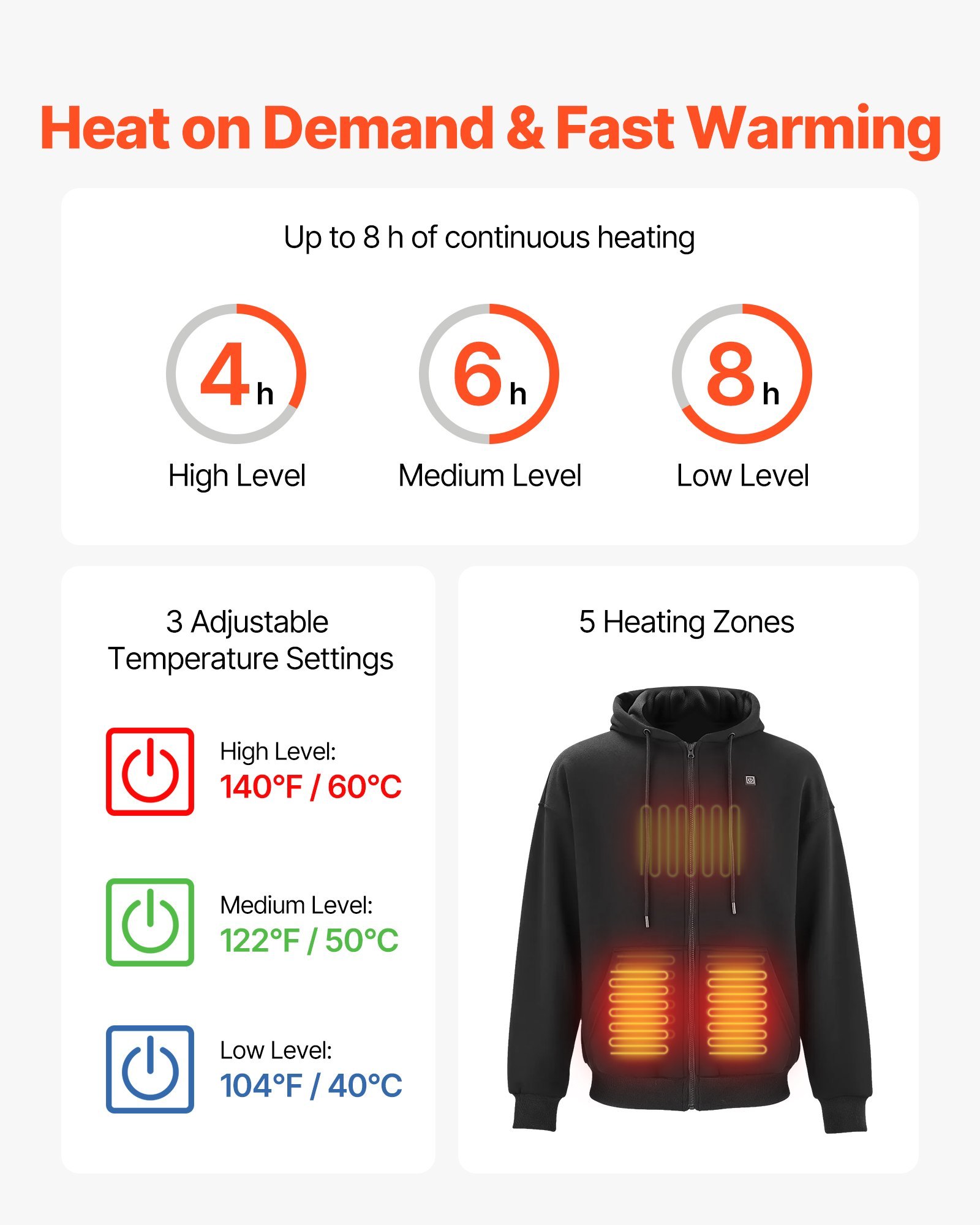 Fast Heating: This heated sweatshirt provides five carbon fiber heating zones (2 abdominal, 1 back, 2 waist) for quick, even warmth. Three adjustable heat levels (104/122/140°F) let you choose comfort, efficiently driving away cold