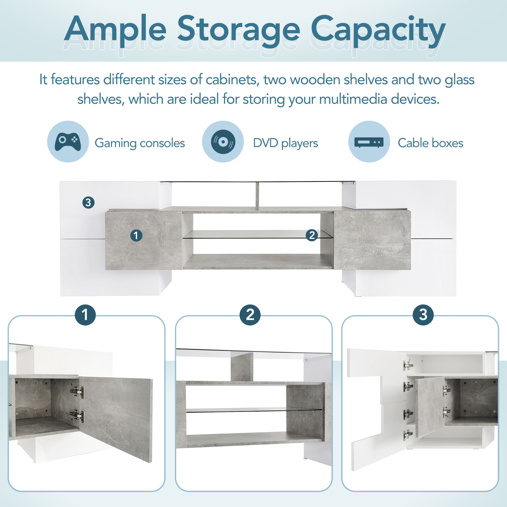 It features different sizes of cabinets, two wooden shelves and two glass shelves, which are ideal for storing your multimedia devices, such as gaming consoles, DVD players and cable boxes, and keeping everything organized and accessible.