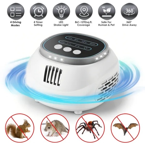 Ultrasonic Rodent Chaser Rat Repellent Pest Driver Mouse Control Squirrel Repeller With 4 Modes 4-65KHz Strobe Light 4 Timer 1292sq.ft. Coverage For Rodent Mouse Rats Squirrels Bats GPCT5491