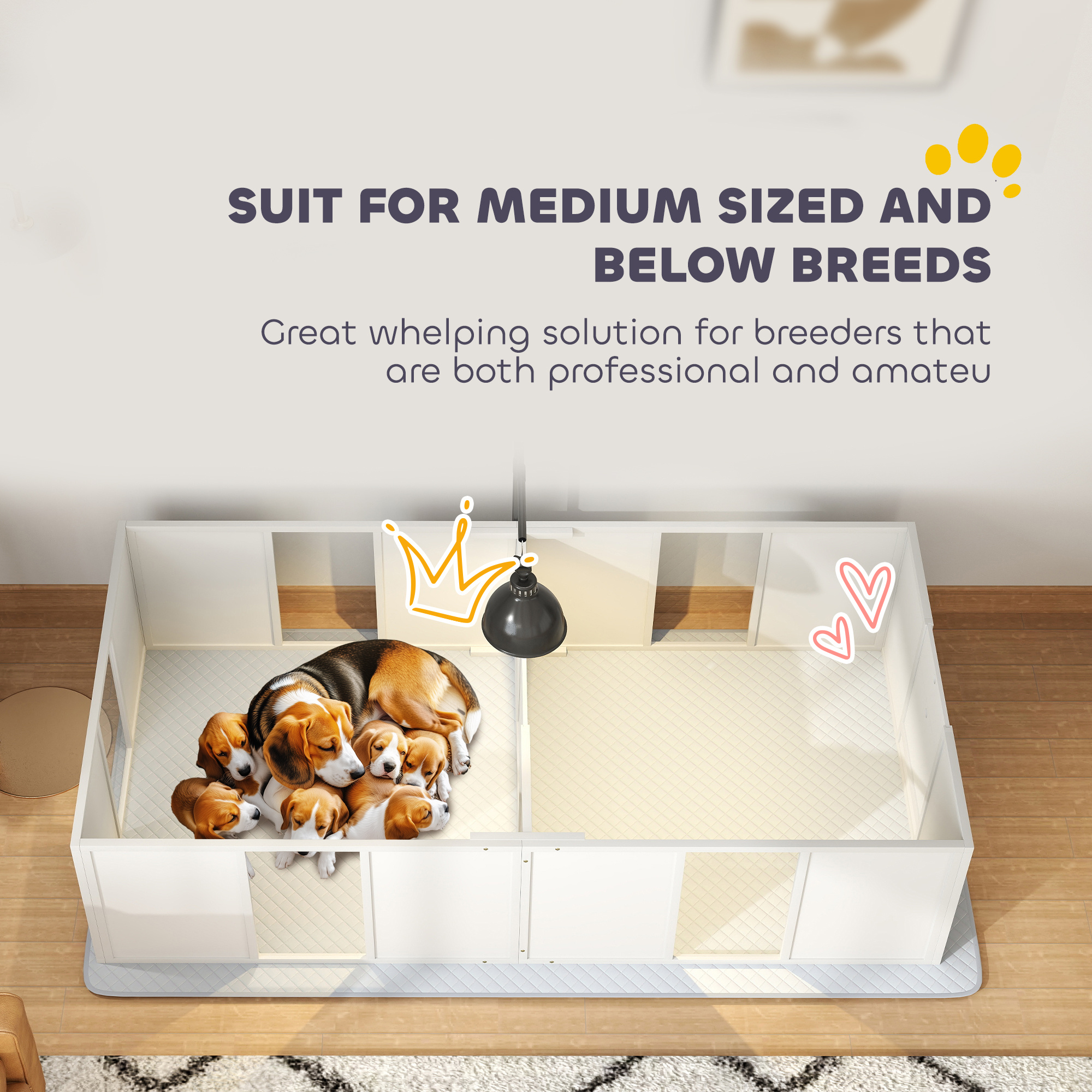 Discover the [BRAND NAME] whelping box, a nurturing haven for your dog and her puppies. This box is equipped with an adjustable lamp stand for warmth and removable panels for secure, easy access. Crafted from pine wood and MDF, it features a windproof, partially sealed design and a transparent acrylic panel for easy monitoring. It’s great for medium-sized dogs, and it offers a cozy, safe space for the pups.